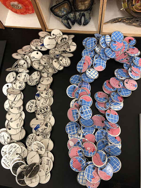 A project lean by Kiff Slemmons where artists are given paper tabs to draw on and then a necklace is made of them all.